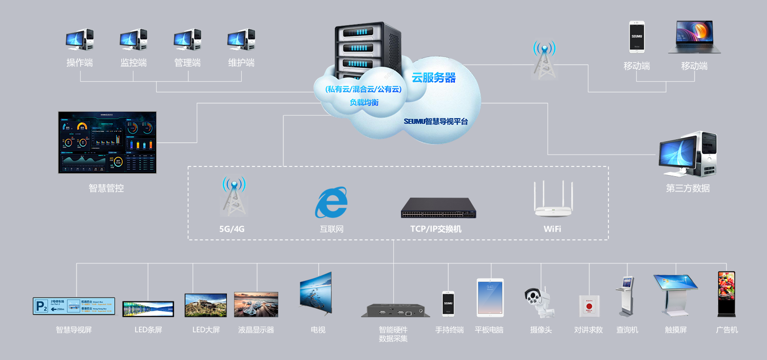SEUMU(升妙)智慧导视平台是一款基于大数据的智慧导视信息服务平台软件,运用智慧信息服务和智慧管控两大核心技术,采用云端控制+智慧屏+智能控制器+数据采集与人机交互+智慧应用+室内导航+5G模式或WIFI6+可视化管理的全新模式的信息系统平台,与传统信息发布系统(动态标识系统、触摸查询)和灯箱标识有本质区别,升妙智慧平台基于大数据、物联网、云计算技术以及可视化管理以及人机交互应用,可以明显减少管理人工成本、提高服务水平,而且通过可视化应用,可以带来更好的用户体验,升妙智慧导视平台系统部署灵活、操作简单、数据提炼精确、安全性高、准确性强、融合性广、扩展便捷,可以非常好的满足公用场所和交通领域智慧化升级应用以及降低运营成本需求。